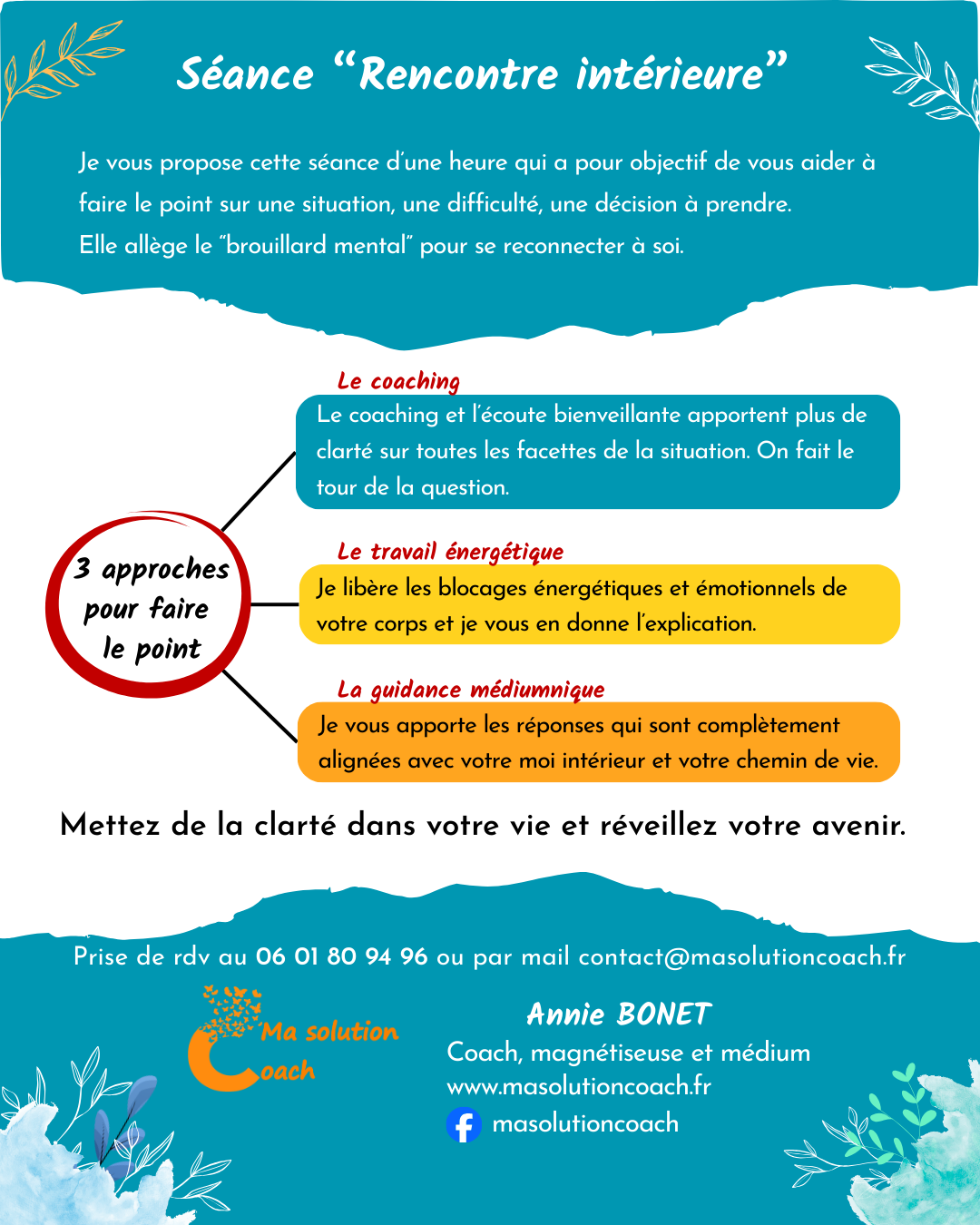 Pour toute information ou précision, n'hésitez pas à me contacter par mail (contact@masolutioncoach.fr) ou par téléphone (06 01 80 94 96).