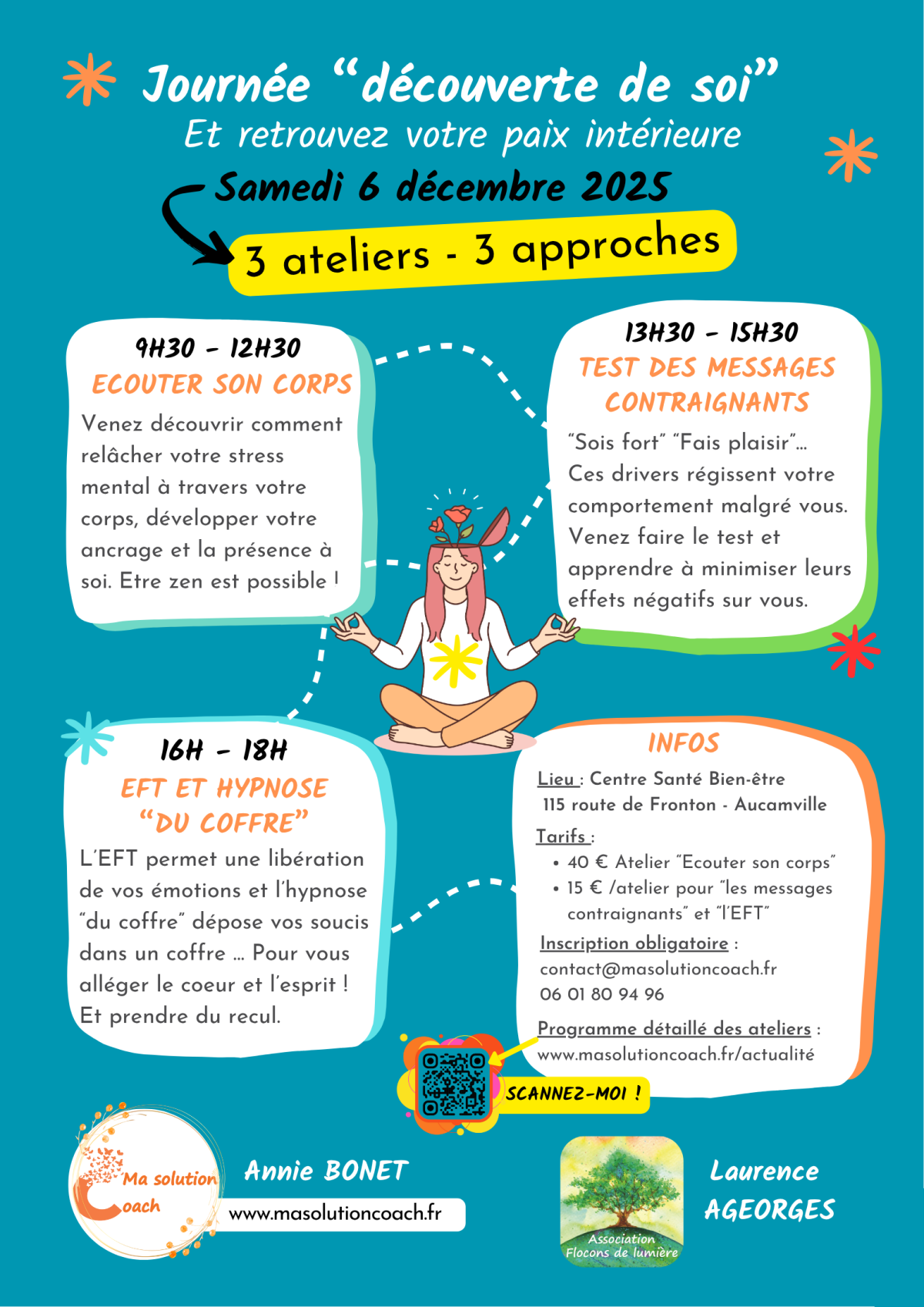 Je vous propose 3 ateliers selon 3 approches différentes pour retrouver votre paix intérieur, votre calme mental.